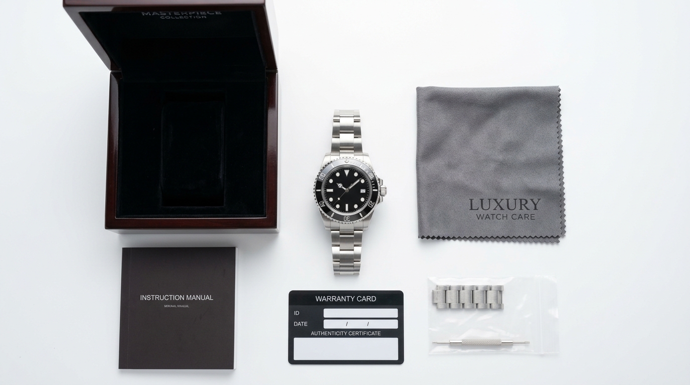 一番大切なのが、付属品を揃えることです。元箱(化粧箱)・専用ケース・説明書・ギャランティカード(保証書)・余りコマ・ベルト・タグ(未使用の場合)など、購入時についていたものは全部一緒に持参しましょう。
